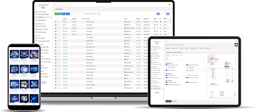 eCommerce One is multilingual and offers you country-specific tax handling and invoicing